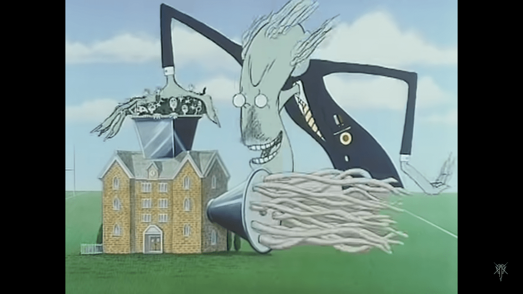 Children sing: “‘We don’t need no education; We don’t need no thought control; No dark sarcasm in the classroom’ Hey [Big Brother]: leave them kids alone!”